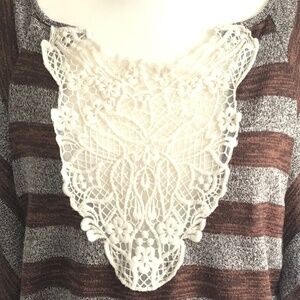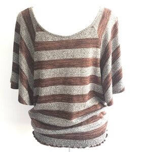 Signature I Studio brown and gray horizontal stripe blouse top. It has draped sleeves and a gorgeous lace piece on the front. Gently used...size medium...no flaws noted...see photos for care details.
