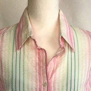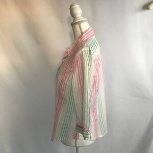 Talbots green. pink, and white button down blouse top. It has 3/4 cuff sleeves. Gently used...size medium...no flaws noted...see photos for care details.