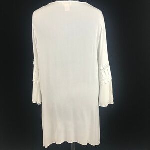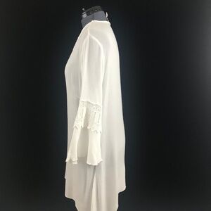 Toffee and Apple semi sheer white dress with lace around the neck and bell shape sleeves. Gently used...size large...no flaws noted...RN 110545...See photos for care details.