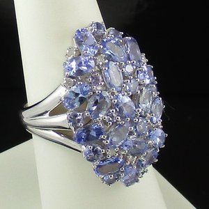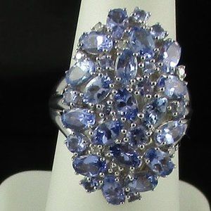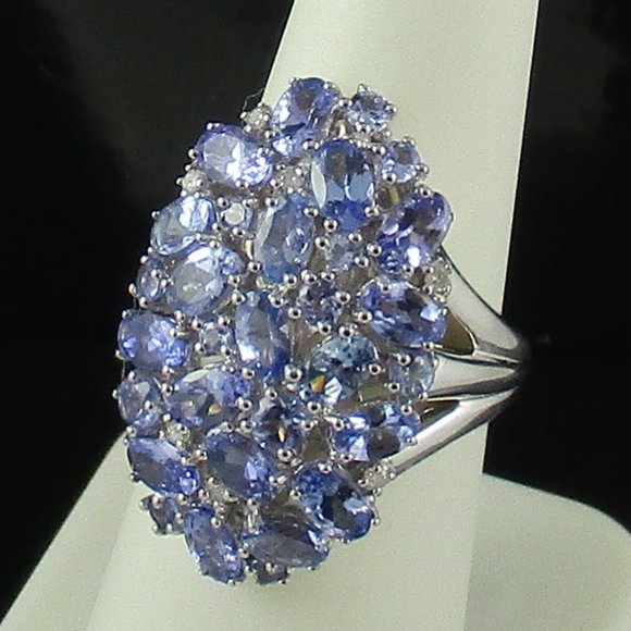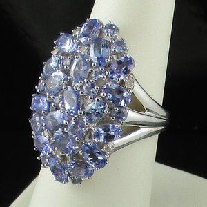 4.20ct Tanzanite Bold Oval Cluster Sterling Silver Ring. Prong-set clusters of oval and round Tanzanite gems combine with round diamonds in an elongated openwork design.