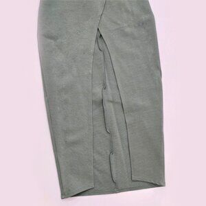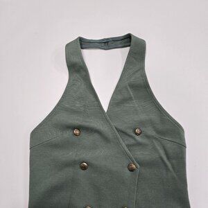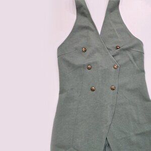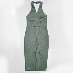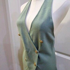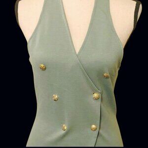 Soft sage green halter tunic w/ a wrap‑front silhouette, gold button accents, & a dramatic front split designed for layered styling.