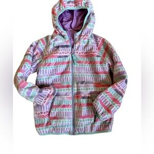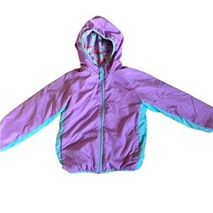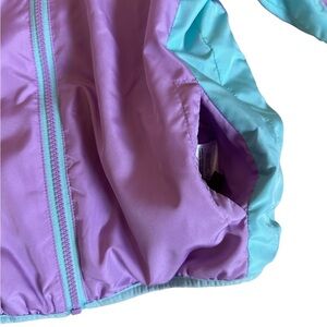 Your little one will look cute, while staying warm in this jacket! The windbreaker side of the jacket is pink with aqua blue accents, matching hood lined with fleece and two hand pockets, also lined with fleece. The other side is in reverse: a cute and colorful pastel graphic in lilac, green, pink and white.