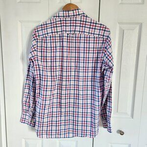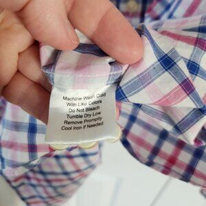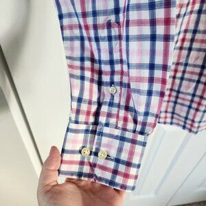This shirt is by Egara. It is pink and blue in a plaid print. It has long sleeves with buttoned cuffs and a collared neckline. It has a button up front closure. It is in excellent pre-owned condition with no holes, rips or stains. Bundle with other items in my closet to get the most out of shipping!