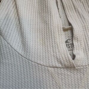 White, waffle texture light weight long sleeve with hood. Some light untreated stains shown in photos.