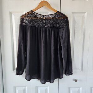 This blouse is by LOFT Ann Taylor. It is black. It is a flowy blouse with long sleeves that close with a button at the cuffs. It has sheer crochet shoulder detailing and a keyhole at the back neck. It is in excellent pre-owned condition with no holes, rips or stains. Bundle with other items in my closet to get the most out of shipping!