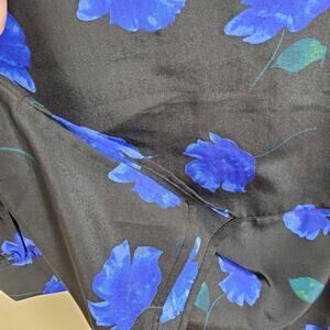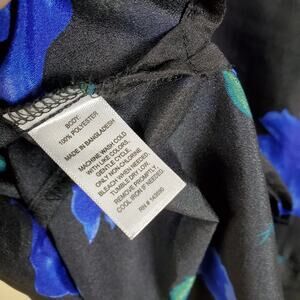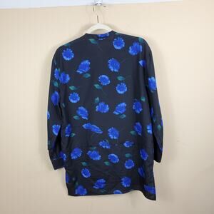 Gently used. Size medium. Blue floral print on black background. Long sleeve tunic top. Hook and eye closures in the front.