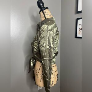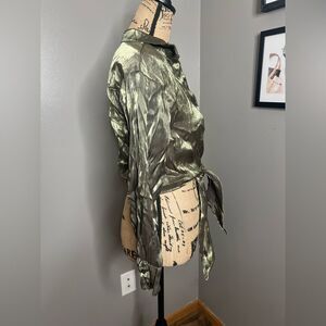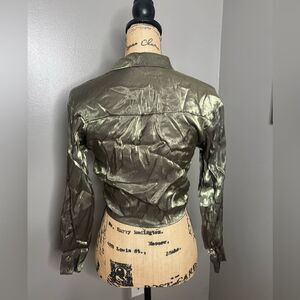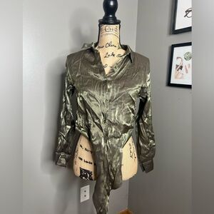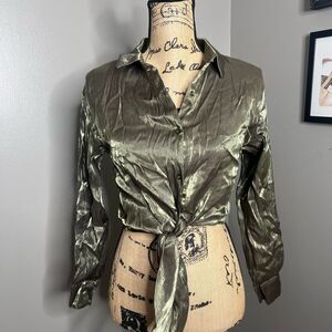 4/$25 Milk & Honey crinkle shimmer green tie front cropped button up shirt small