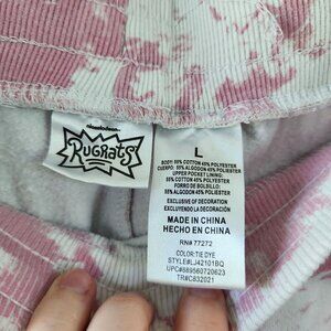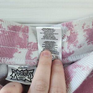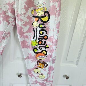 These pants are by Nickelodeon featuring the show Rugrats. It has the title and characters in a graphic down the leg. The pants are pink and white in a paint splatter pattern. They are a jogger style with a drawstring tie waist. They are in excellent pre-owned condition with no holes or rips. There are a couple small blue stains to the back left leg. Bundle with other items in my closet to get the most out of shipping!