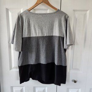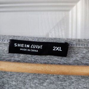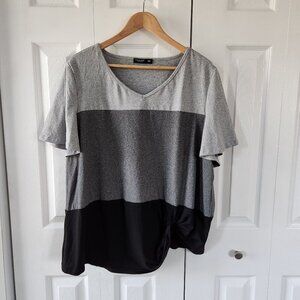 This shirt is by Shein Curve. It is gray and black in a color block print. It has short sleeves and a v-neck line. It also has a knotted detail at the front left hem. It is in excellent pre-owned condition with no holes, rips or stains. Bundle with other items in my closet to get the most out of shipping!