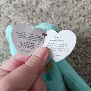 This Ty Beanie Baby is Ariel the Bear. It was made in memory of Ariel Glaser 1981-1988. It is in excellent pre-owned condition with no holes, rips or stains. There is minor wear to the ear tag. Bundle with other items in my closet to get the most out of shipping!