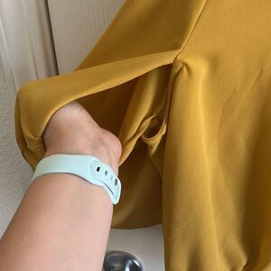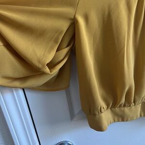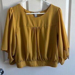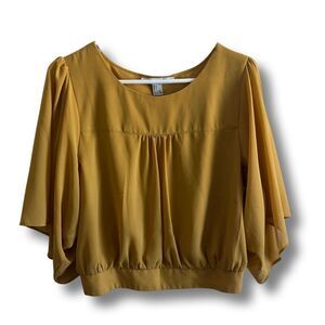 Flowy, mustard-yellow top in great condition. Size L. Wide, flowy sleeves with openings at the armpits. Elastic band at the hem in the back.