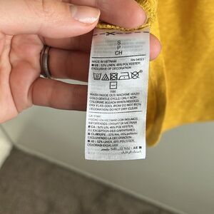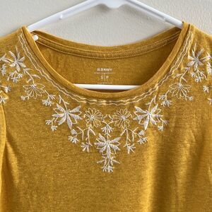 Adorable yellow top with embroidered neckline. Size small. Good condition. Minor pilling. Normal wear.
