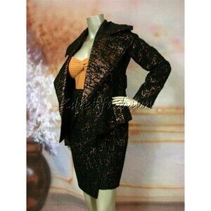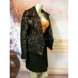 Style : fabulous suit, soft black material with a copper metallic under layer, gorgeous artistic design, both pieces fully lined Jacket: two front pockets, open front, back flap and belt detail, comes with its hanging Donna Karan tag / Skirt: wrap style, side clasp closure, alluring pencil skirt cut, comes with its hanging Neiman Marcus tags, it is a gorgeous Donna Karan jacket that is very stylish and attention grabbing