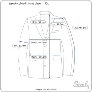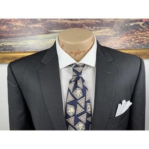 * Welcome to The Opulent Gent; A Splendid Collective. Presented is a sharp looking blazer by Joseph Abboud. Fabric by Tollegro 1900, imported from Italy. Charcoal color on a sharkskin weave. Hand picked stitching around pockets and lapels. I’ve paired with an abstract Ermenegildo Zegna tie. Speaking of, if you purchase the jacket at full price I’ll include the matching tie for free!* Check my store for anything else you’re interested in. More measurements listed in pictures. Please be aware that all sales are final. Thanks for visiting and have a great day!