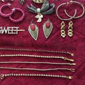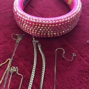 Here is a 43 piece lot of retro & vintage rhinestone jewelry for the collector. It is the last of the rhinestone in gold tone settings and the last of the colored rhinestones. I have one more lot to list which will be the last of the rhinestones in all silver tone settings. There are some very old pieces in this lot, especially the brooches. Some are prong set and some are pasted in (pave"), more prong than pasted. Some of the vintages pieces have has stones have been replaced. Some of these are from my collection and some are from my mom's estate. As with all of my past lots the jewelry is in good to very good condition. There are 2 stones missing from the headband but they are hard to see, otherwise if you purchase this lot be aware that there maybe missing rhinestone that I do not see.