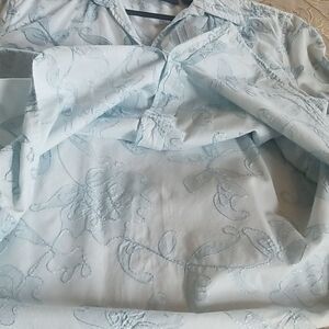 Sassy powder blue blouse with stiched outline roses, buttoned down front, 5 small buttons, Machine wash, cold water