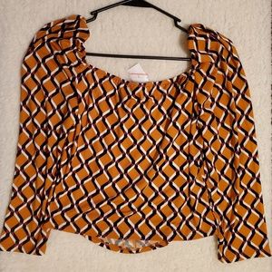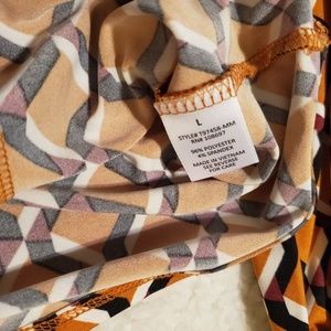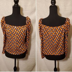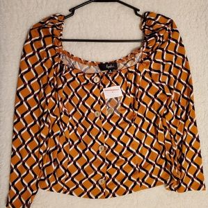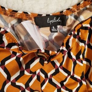 This brand new Lipslide top is orange, burgundy, black and white. This shirt scoop in the front and back. This shirt is a long sleeve.It has 4 buttons going down the front of the shirt. You can not unbutton this shirt. It's made if 96% polyester and 4% spandex. This shirt can be worn for just about any event.