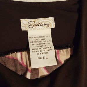 Brown, tan and a little red. This shirt has been worn once. It's made out of 95% polyester and 5% spandex. In great condition