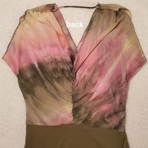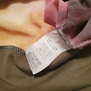 This lovely youth large, made of 100%polyester top. Can be worn with jeans, shorts or a skirt. It's mixture blend of pink, green, with a light yellow. Sleeveless with a draw strap shoulder, with a strap that droops across the back. With a drawstring look in the front of the shirt. With a v-neck in the front and back. The bottom part of the shirt is made of cotton.