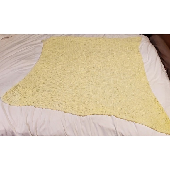 43"×38" Hand-made OOAK Crocheted Baby Blanket Yellow with Pink and Blue Spots in very good pre-owned condition. See photos for details. POOS