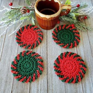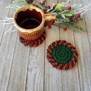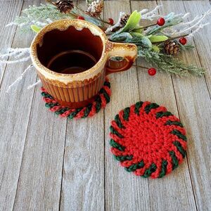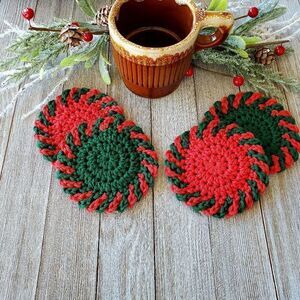 Hand crafted crochet coasters in red and green just in time for the Christmas holidays.