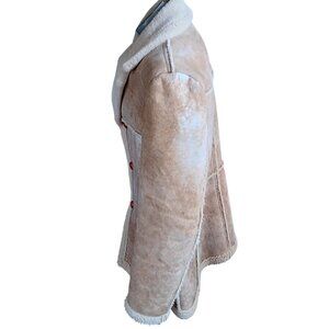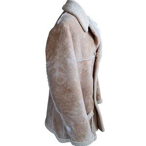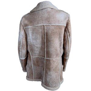 This vintage shearling sheepskin coat offers a cozy yet stylish option for colder days. The tan and cream hues give it a classic look, while the generous large size ensures a comfortable fit. Perfect for those who appreciate timeless outerwear with a touch of rustic charm.