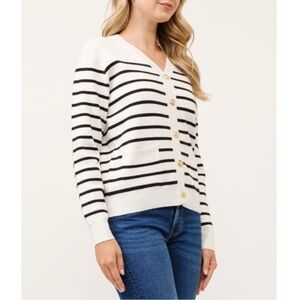440 • Black/White Striped Viscose Blend Knit Cardigan w/Pockets & Gold Buttons