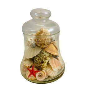 This glass jar, complete with a lid, houses a collection of small sea shells, serving as a charming decorative piece or a unique gift for a nature lover.