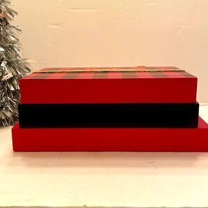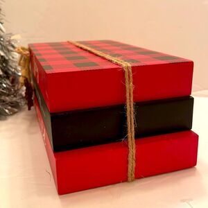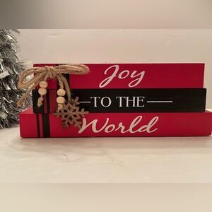 Wooden blocks proclaiming’Joy to the World’ in red, black, and buffalo plaid.