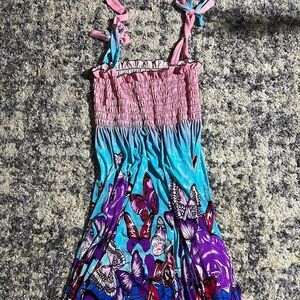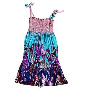 447-Butterfly and flower print dress with adjustable straps and elastic waist