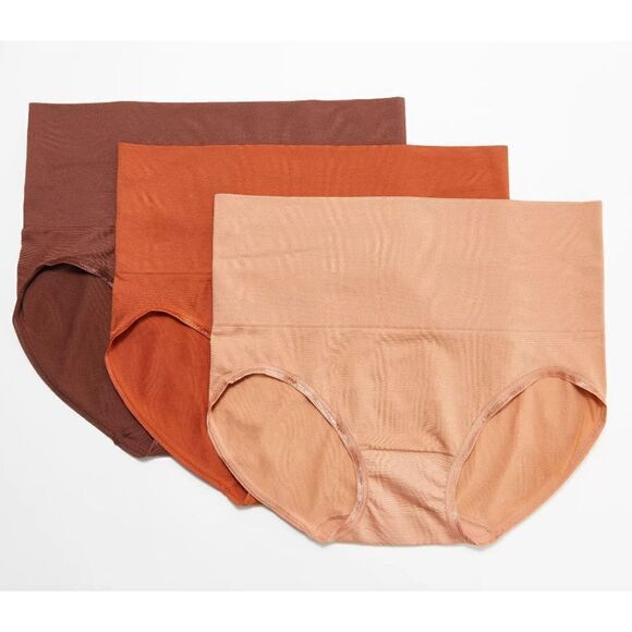 Retail: $44Includes three brief pantiesFabrication: KnitFeatures: Seamless, double-layer wide waistband, flag leg elastic leg openingsContent: 93% nylon, 7% spandexCare: Hand wash, line dry