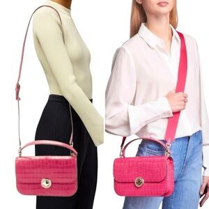 3 Way: Top carry handle, Adjustable matching croc embossed leather crossbody strap, Adjustable pink guitar crossbody strap