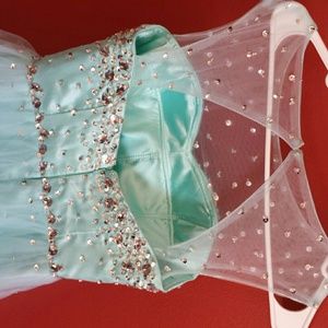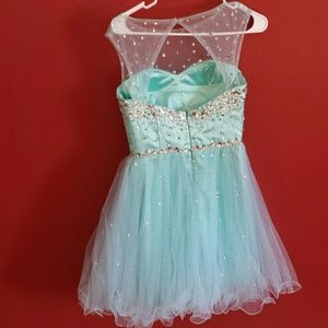 Turquoise dress. Worn once for homecoming. Size 4. Open back and a cap on the top (see through material at the top). Beading throughout the dress.