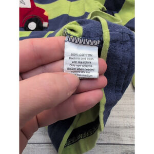 GUC Just Ducky long sleeve applique tee. Green and blue stripes with corduroy truck applique. Light wash wear/pilling