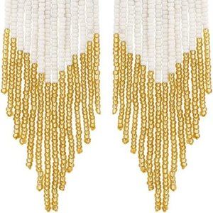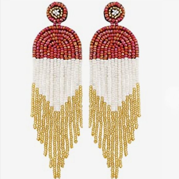 Approx 4.5" handcrafted dangle earrings in red , white , and gold in an Art Deco sort of style. More colors listed separately.