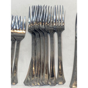 Modest wear from use, still useable and presentable. 7 table spoons. 14 teaspoons, 8 short forks, 8 long forks, 8 knives.