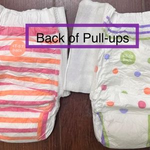 48 count of Size 4-5 toddler disposable training pants. Pampers Easy-ups and Huggies Pull-ups and possibly other generic brands included. All different designs are included in pictures. All are New, packages opened, Never used.