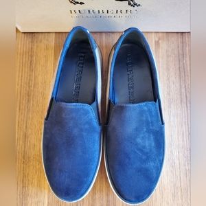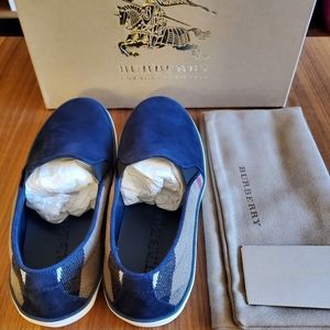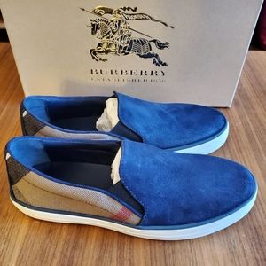 Brand New 100% Authentic Women's Gauden Slip On Burberry Sneakers in Navy Color. The shoes are crafted from dark Navy Suede and Burberry Nova Check plaid.