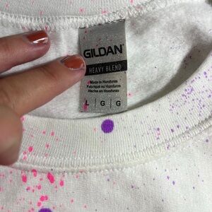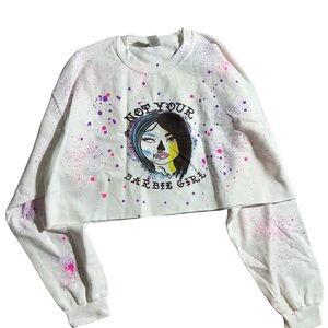 453-White and pink paint splatter cropped sweatshirt with "not your barbie girl" print on the front. #barbie #croptop #paintsplatter