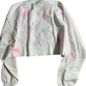 453-White and pink paint splatter cropped sweatshirt with "not your barbie girl"
