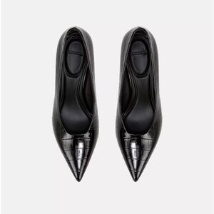 An architectural twist on the timeless pointed-toe pump, the Diane is crafted from croc-embossed leather and finished with a modern squared topline and sculpted heel. Subtle sporty undertones add covert comfort, from a sleek rubber outsole to a cushioned leather footbed.