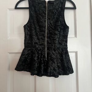 DESCRIPTION: Ready for night out? This little number is a head turner. Tank top with a peplum detail. Zipper back closure. There is a hook/eye closure, the hook portion is loose but intact.