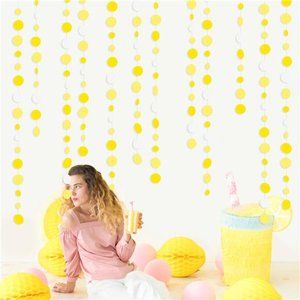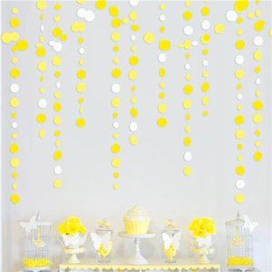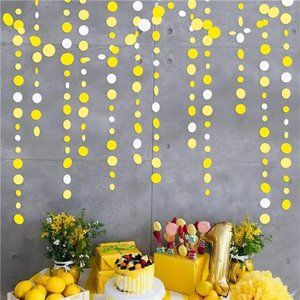 🧿🟡PACKAGE CONTAINS-4 packs of yellow white paper circle dots garland streamer, Each string is 11.5 feet/3.5 meters, Total is 14 meters/46 feet.