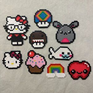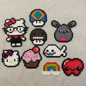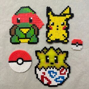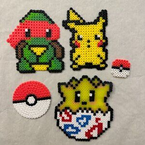 This is a bundle of 46 pieces of perler bead pixel art, also known as fuse bead art. The pieces are overall in Good condition with mainly the Togepi having the main flaw. It's in good shape and fused tightly, but the backside has 2 indent line and on the front it has a spot that's overly smooth on the right side by the eyes. its hard to see if you're hanging it as a magnet or something, but on close inspection you can see it. Other than that they are overall in good shape. They are all tightly fused and the backs are free of residue, so you can turn them into magnets, hang them, glue them, whatever you want. These come from a smoke free and pet free home and will be packaged and shipped with great care.