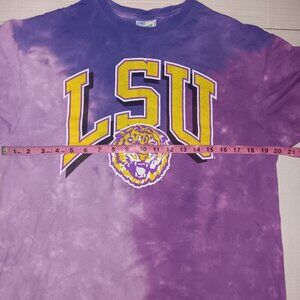 Size Large Adult Women's - 47 LSU Purple and Yellow Multi color Tie dye print with LSU logo on the front, short-sleeved t-shirt the Material is 100% Cotton in pre-owned condition