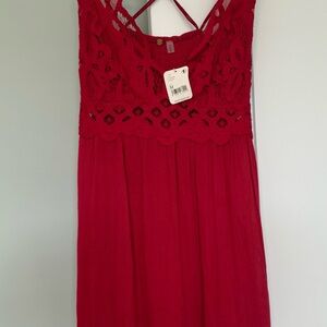 Features: Comfy jersey fabrication, plunge neckline, lace-up back, layered skirt, handkerchief hem