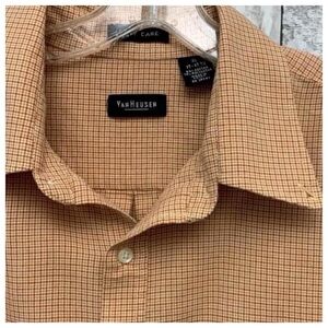 Gently worn, excellent condition men's Van Heusen easy care check plaid button down short sleeve shirt. Size extra large; 17/ 17.5. What you see is what you will receive. 100% authentic. Approximate flat lay measurements: 26” chest pit to pit, 30” long, 21” shoulder.