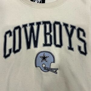 Keywords: Cowboys sweater, NFL apparel, men's pullover, cotton blend, long sleeve, crewneck, ribbed cuffs, embroidered logo, sports theme, football fan, casual wear, game day outfit, off-white sweater, '47 brand.
