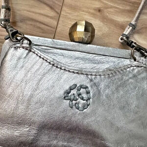 Amazing clutch / crossbody bag from 49 SQUARE MILES, an ANTHROPOLOGIE brand! Intentionally Distressed silver leather with antique bronze hardware. Removable long strap to go from crossbody / shoulder strap to convert to clutch! Card slots, and two pockets inside. Used a handful of times - minor signs of normal wear.