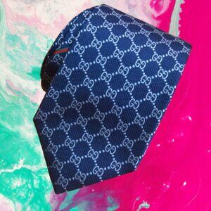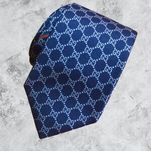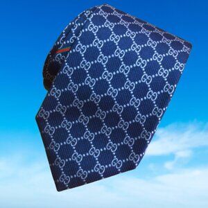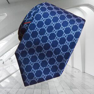 $490 Rare Gucci Interlocking GG Logo Guccissima Navy Blue Silk Neck Tie Italy